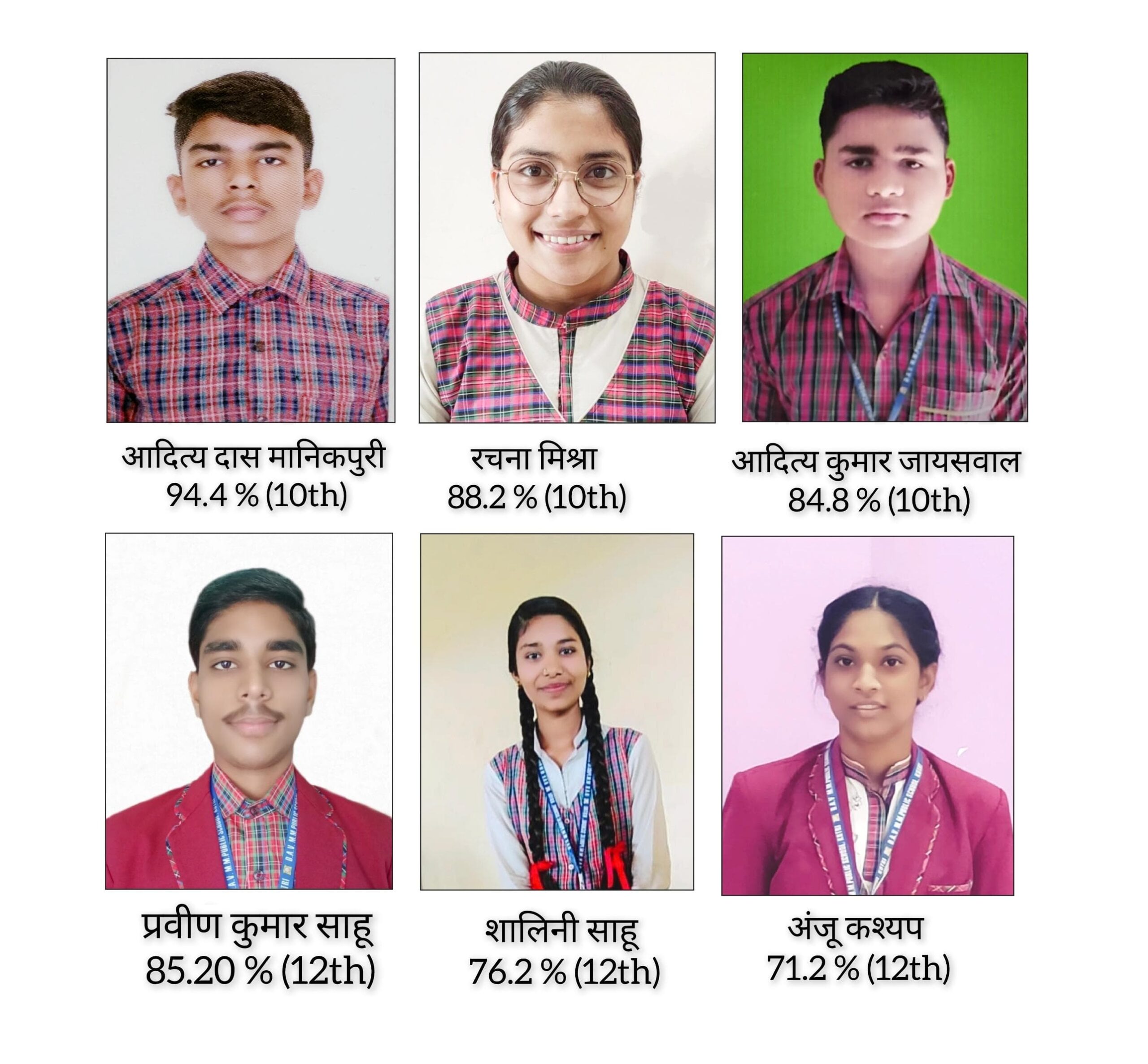 10 वीं में 94.4 प्रतिशत अंक के साथ आदित्य मानिकपुरी अव्वल, वहीं 88.2 प्रतिशत अंक हासिल कर रचना मिश्रा दूसरे स्थान पर, 12 वीं में प्रवीण 85.20 फीसदी अंकों के साथ प्रथम स्थान प्राप्त किया है।