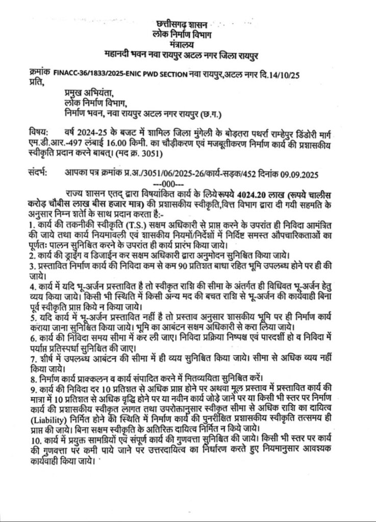 आशुतोष ठाकुर. लोरमी विधानसभा क्षेत्र के ग्रामीण अंचल के लिए बड़ी खुशखबरी है। जहां राज्य शासन ने राम्हेपुर–पथर्रा–डिंडोरी मुख्य मार्ग के निर्माण को मंजूरी दे दी है। लगभग 40 करोड़ 24 लाख रुपए की लागत से बनने वाली इस सड़क का कार्य लोक निर्माण विभाग द्वारा कराया जाएगा। यह सड़क बोड़तरा से डिंडोरी तक करीब 16 किलोमीटर तक फैली होगी, जिससे लोरमी के ग्रामीण इलाकों को कोटा–पंडरिया–कवर्धा मुख्य मार्ग से सीधा संपर्क मिल जाएगा।